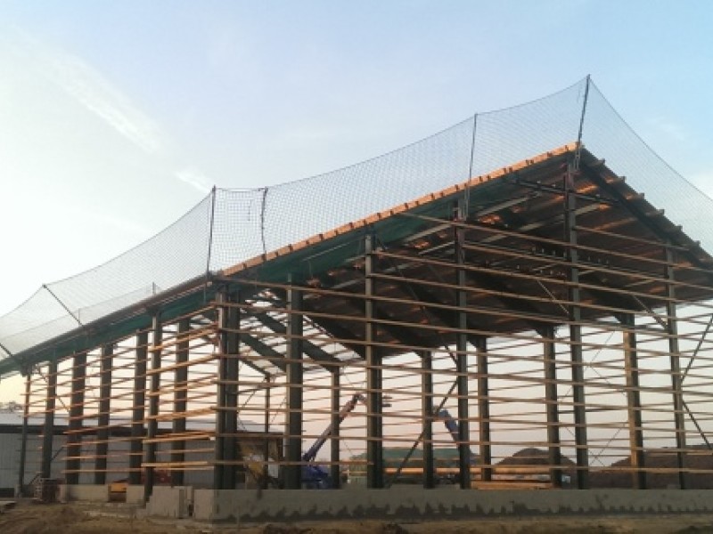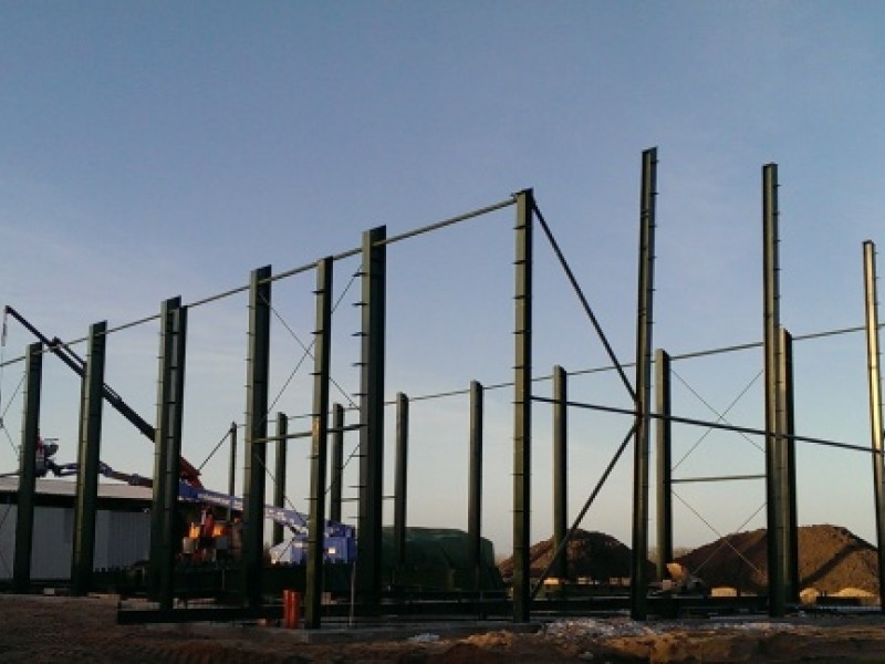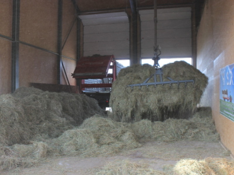 Für diese Anlage musste zunächst auf unserem Gelände eine Halle von 40 x 23 x 15 Metern Größe gebaut werden, in die die Heu-Ladenwagen einfahren. Ein Deckenkran mit einer Zange hebt das Heu an und wirft es in die drei zur Belüftung notwendigen Boxen.